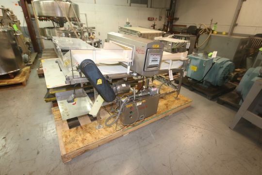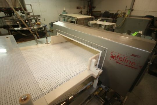 Safeline S/S Metal Detector Conveyor, with Aprox. 24" W x 4-1/2" H Opening, Mounted on Power Conveyor with Interlock Plastic Belt, Overall Dims.: Aprox. 80" L x 38" H (IN#69013) (Located at the MDG Auction Showroom in Pgh., PA)(Rigging, Handling & Site Management Fee: $500.00)