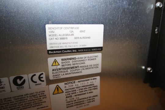 Beckman Coulter Benchtop Centrifuge, M/N Allegra 6R, S/N H83329, 208 Volts, 60 Hz(IN#66036) (Location: MDG Auction Showroom in Pittsburgh, PA)(For Packaging & Loading Quote, Contact Pak Mail at: customerservice@pakmailpittsburgh.com)
