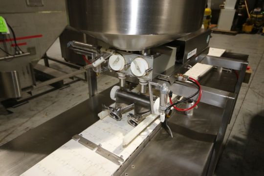 Unifiller 2-Piston Depositor, Aprox. 17" W x 18" H Bowl, Mounted on 20 ft 8" L Conveyor System with 9" W Plastic Belt with Drive, Control Box with Mitsubishi FX0-30MT PLC Controller & VFD 460V (IN#69071) (LOCATED AT M. DAVIS GROUP AUCTION SHOWROOM--PITTSBURGH, PA)(Rigging, Handling & Site Management Fee: $175.00)