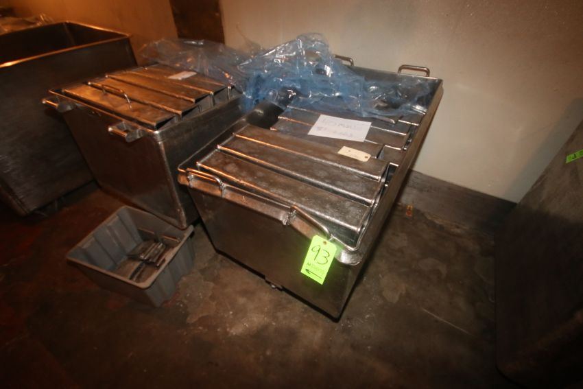(2) S/S Portable Totes & (1) Stationary S/S Tote, with (71) S/S Round Rib Molds, (45) S/S Chopped Ham Molds, (40) S/S Molds, and (81) S/S Lids Overall Tote Dims.: Aprox. 53" L x 32" W x 32" H (Located on Basement Floor--McKees Rocks, PA)(Rigging, Handling & Site Management Fee: $150.00)