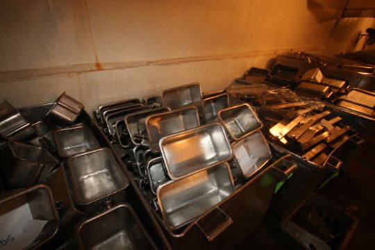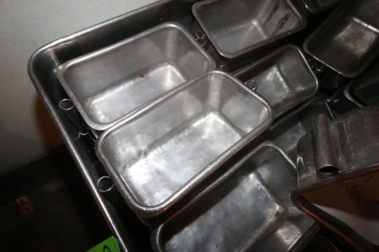 (1) S/S Portable Tote & (1) Stationary S/S Tote, with (100) Square Ham S/S Molds & (70) S/S Square Molds, Stationary S/S Tote Dims.: Aprox. 54-1/2" L x 37" W x 41" H, Portable S/S Tote Dims.: Aprox. 50" L x 31" W x 38-1/2" H (Located on Basement Floor--McKees Rocks, PA) (Rigging, Handling & Site Management Fee: $150.00)