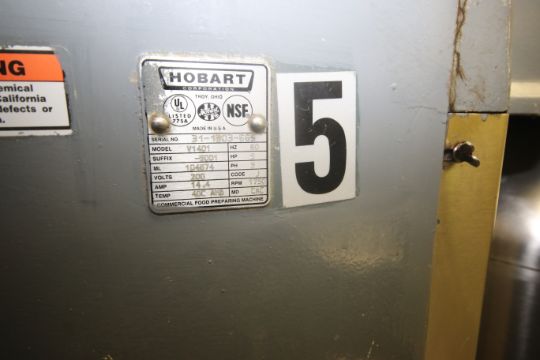Hobart Mixer, M/N V1401, S/N 31-1303-665, with 5 hp Motor, 1750 RPM, 200 Volts, 3 Phase, with S/S Mixing Bowl, Flat Beater Attachment, & Protection Cage (LOCATED AT BAKE SHOP--409 AIRPORT BLV. MORRISVILLE, NC 27560)(Rigging, Handling & Site Management Fee: $350.00)