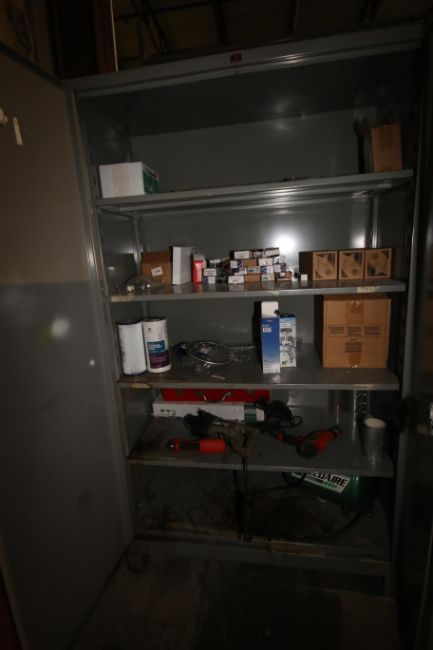 (2) Double Door Vertical Parts Cabinets with Contents, Includes Assorted Hardware, Air Hose, Fuses, Emergency Lights, Power Drill, NEW Safety Mirror, & Other Present Contents, Lot Includes S/S Wire Shelf & Wall Mounted Shop Shelf (LOCATED AT BAKE SHOP--409 AIRPORT BLV. MORRISVILLE, NC)(Rigging, Handling & Site Management Fee: $50.00)