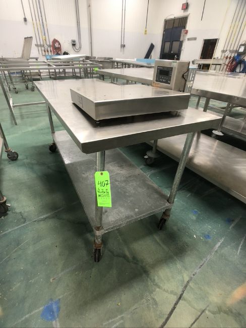 S/S TABLE PORTABLE / MOUNTED ON CASTERS WITH BOTTOM SHELF, INCLUDES WEIGH-TRONIX TABLE TOP PLATFORM SCALE, MODEL BS-2020-A, APPX DIM. OF TABLE LWH'' 72 X 30 X 34