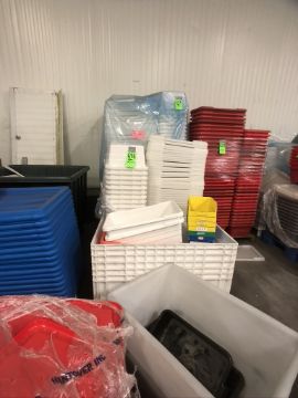 LOT OF ASSORTED BINS, HOPPERS, LIDS ETC. (3) TOTES, (1) PALLET OF RED LIDS, STACK LARGE BLUE LIDS, LARGE PORTABLE GREY PLASTIC HOPPER