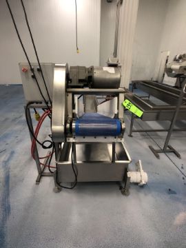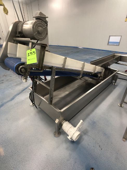 TS DESIGNS APPROX. 80" W X 224" L (OVERALL DIMS) S/S FLUME WITH CHILLER AND S/S WATER BATH SYSTEM, INCLUDES APPROX. 32" INCLINE CONVEYOR WHICH RUNS THROUGH ENTIRE LINE, TOP OF CONVEHOR APPROX. 30" OFF THE GROUND AT BEGINING AND APPROX. TO 60" AT END (SOME ROOM FOR ADJUSTMENT), S/S WASHDOWN MOTOR, CONTROL PANEL, ORIGINALLY PURCHASED FOR PROCESSING DICED ONIONS AND LATER PEPPERS, INCLINE CONVEYOR DUMPED INTO A 55 GALLON CONTAINER WITH HOLES WHICH WOULD BE PLACED INTO A SPIN DRYER FOR DEWATER AND DRYING.