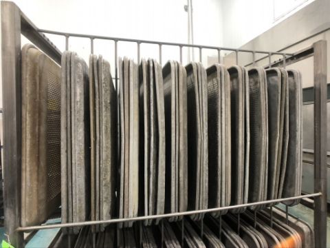 APPX 100 BAKING PANS (SOME PERFORATED) APPX DIM. OF PANS L21-1/2'' X W17-1/2'' INCLUDES S/S PORTABLE RACK ON CASTERS APPX DIM. OF RACK L35'' X W26-1/2'' X H73'' (Rigging and Loading Fee, Packaging Available at Extra Cost): $35