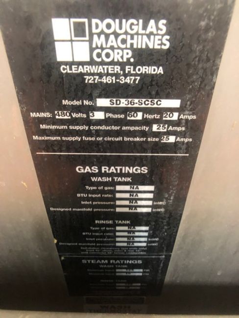 DOUGLAS MACHINE CORP DISHWASHER, MODEL SD-36-SCSC, WITH HOT WATER TANK (BELIEVED TO BE 2015)(INV#74497)(LOCATED AT THE MDG SHOWROOM IN PGH., PA) (LOAD & RIG FEE $325.00 - OPTIONAL PALLETIZING, SKIDDING OR CRATING ADDITIONAL)