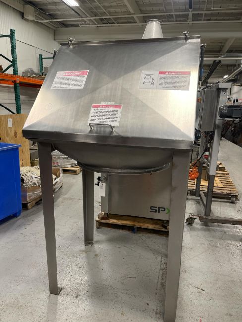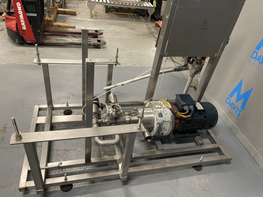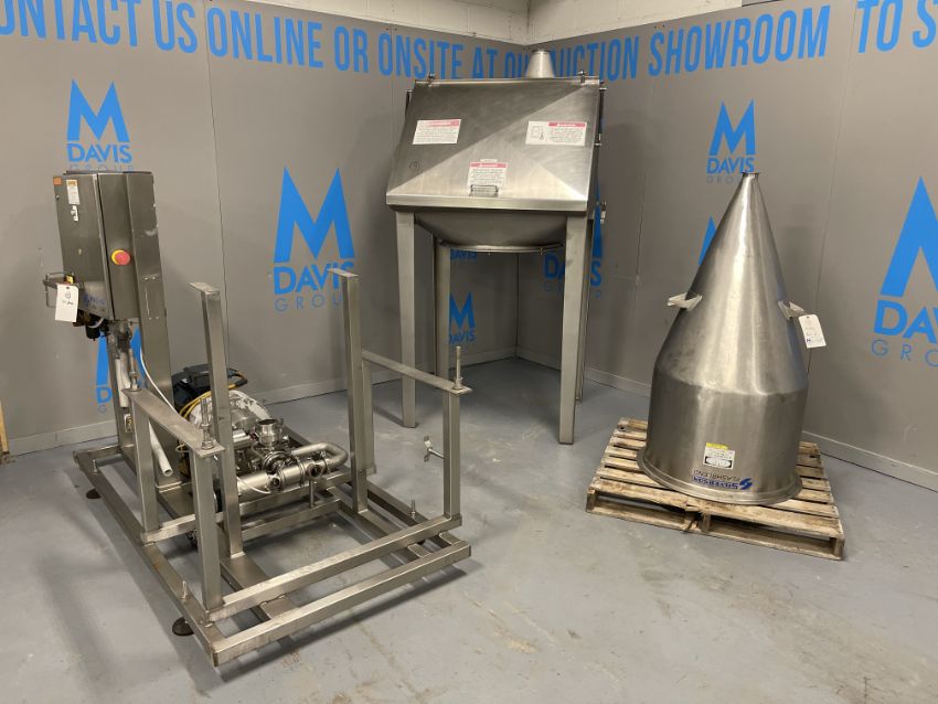 Silverson Shear Pump, part of a Silverson Flashblend System, with rectangular hopper & round hopper (round hopper attaches to rectangular) with Butterfly Discharge, with S/S Funnel, Mounted on S/S Skid (INV#69025) (LOCATED AT MDG AUCTION SHOWROOM--PITTSBURGH., PA) (Rigging, Handling & Site Management Fee: $125.00 USD)