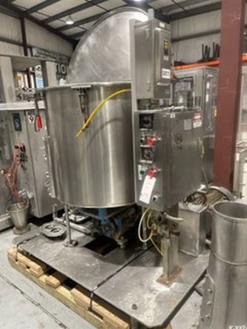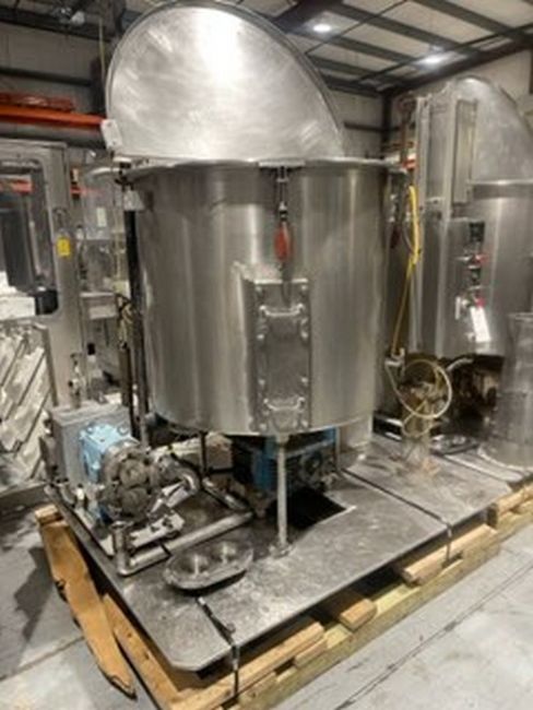 Aprox. 200 Gal. S/S Mixing System,Tank Internal Dims.: Aprox. 36" Deep x 40" Dia., with S/S Hinge Lid, Includes S/S Multi-Blade High Yield Agitation, with 30 hp/1750 RPM Agitation Motor, 460 Volts, 3 Phase, with Waukesha Size 060 Positive Displacement Pump, with Control Panel, System is Skid Mounted (INV#77746)(Located @ the MDG Showroom - Pittsburgh, PA)(Rigging, Loading & Site Management Fee: $225.00 USD)