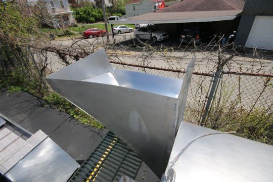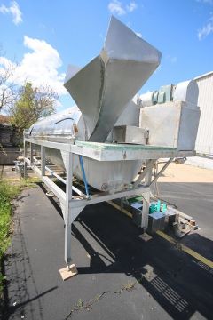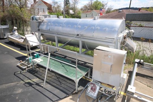 S/S Blancher, with Includes Leeson 5 hp S/S Clad Motor, Top Mounted, with S/S Infeed & Outfeed Chute, with Aprox. 13' " x 52" Dia. S/S Blanching Chamber, Overall Dims.: Aprox. 17' L x 5' W x 96" H, with S/S Platform with Plastic Grating, with Control Panel (NOTE: Controls Missing in Control Panel--See Photographs) (INV#68813)(LOCATED IN MDG AUCTION SHOWROOM--PITTSBURGH, PA) (Rigging, Handling & Site Management Fee: $1,000.00)