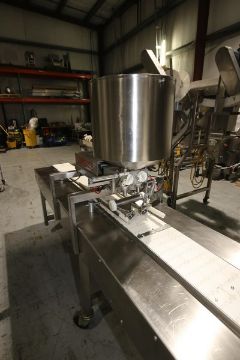 Unifiller 2-Piston Depositor, Aprox. 17" W x 18" H Bowl, Mounted on 20 ft 8" L Conveyor System with 9" W Plastic Belt with Drive, Control Box with Mitsubishi FX0-30MT PLC Controller & VFD 460V (INV#69071) (LOCATED AT M. DAVIS GROUP AUCTION SHOWROOM--PITTSBURGH, PA) (Rigging, Handling & Site Management Fee: $350.00)