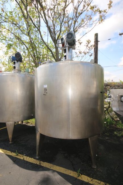 Aprox. 1,000 Gal. Dome Top Cone Bottom Jacketed S/S Mix Tank, with Dimple Interior, Top Mounted Agitator with (4) Prop Agitation with 3 hp/ 1770/ 1480 RPM Drive Motor, 230/460 Volts & 200/400 Volts, 3 Phase, with Pressurized Lid with Sight Glass & Sprayball, (4) 1.5" & 2" Clamp Type Top Port Connections, (2) 1.5" Side Bottom Clamp Type Connections & 2" Bottom Port Connections, Overall Dims.:  Aprox. 76" W x 10' H (To the Top of Agitator) (INV#78673)(Located @ the MDG Auction Showroom in Pittsburgh, PA)(Rigging, Loading & Site Management Fee: $500.00 USD)