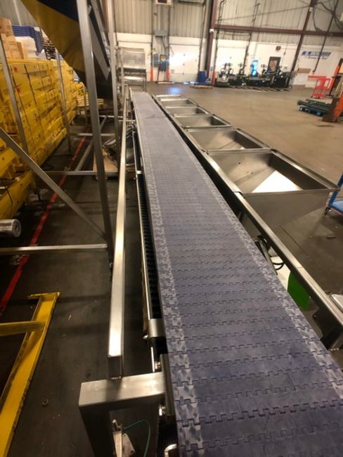S/S VARIABLE SPEED CONVEYOR, SIDE CHOPPINGTABLES WITH CUTTING BOARD STANDS, WITH S/S WASHDOWN MOTOR, LENZE AC TECH VFD WITH SPARE, APPX CONVEYOR DIM. L225'' X W11-3/4'' (BELIEVED TO BE BUILT BY TS DESIGN) (INV#74547)(Located at the MDG Auction Showroom in Pgh., PA)(LOAD & RIG FEE $375.00 - OPTIONAL PALLETIZING, SKIDDING OR CRATING ADDITIONAL)