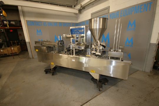 BWI Fords Holmatic 2-Lane Cup Filler,M/N PR-2, S/N 379572, 220 Volts, with S/S Infeed Funnel & Tamper Evident Station, with Aprox. 3-1/2" Dia. Cup Dies, Mounted on S/S Frame (INV#77626)(Located @ the MDG Showroom in Pittsburgh, PA)(Rigging, Loading & Site Management Fee: $550.00 USD)