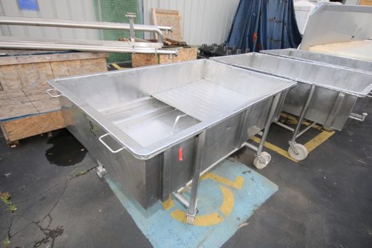 Portable S/S Cheese Drain Table, 3" Clamp Type Bottom Connection, Internal Dims.: Aprox. 70" L x 44" W x 16" D, Aprox. Overall Dims. 80" L x 48" W x 3' H (Note: Only has one screen)(INV#77639)(Located @ the MDG Showroom in Pittsburgh, PA)(Rigging, Loading & Site Management Fee: $100.00 USD)