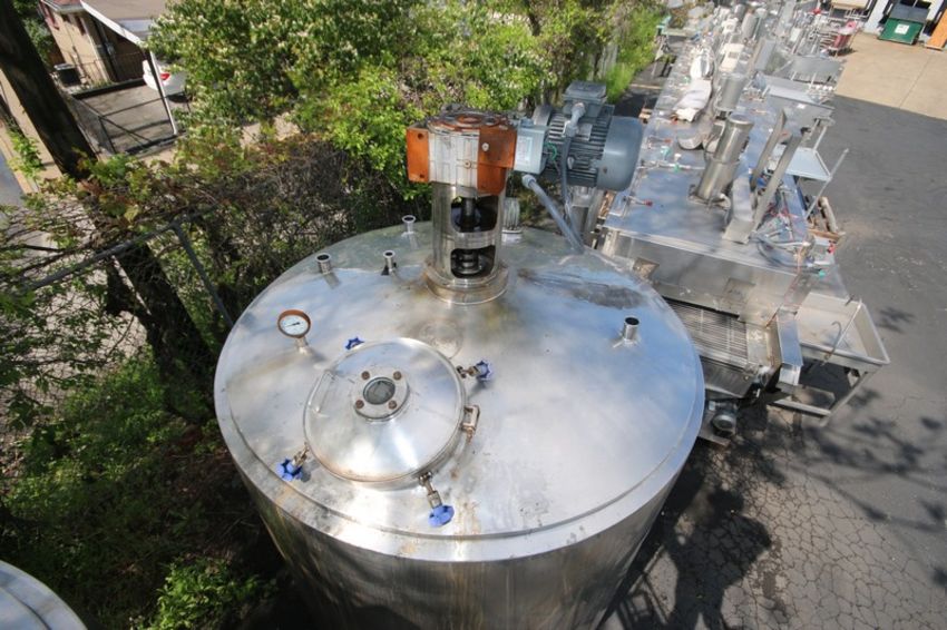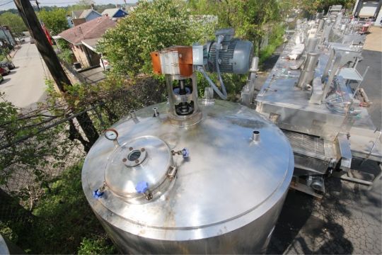 Aprox. 1,000 Gal. Dome Top Cone Bottom JacketedS/S Mix Tank, with Dimple Interior, Top Mounted Agitator with (4) Prop Agitation with 3 hp/ 1770/ 1480 RPM Drive Motor, 230/460 Volts & 200/400 Volts, 3 Phase, with Pressurized Lid with Sight Glass & Sprayball, (4) 1.5" & 2" Clamp Type TopPort Connections, (2) 1.5" Side Bottom Clamp Type Connections & 2" Bottom Port Connections, Overall Dims.: Aprox. 76" W x 10' H (To the Top of Agitator) (INV#78673)(Located @ the MDG Auction Showroom in Pittsburgh, PA)(Rigging, Loading & Site Management Fee: $500.00 USD)