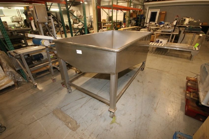 S/S Slanted Bottom Tote, Overall Dims.: Aprox. 83" L x 49" W x 46" H, with Aprox. 6" Clamp Type Discharge, Mounted on S/S Portable Frame (INV#80731)(Located @ the MDG Auction Showroom in Pittburgh, PA)(Handling, Loading & Site Management Fee: $50.00 USD)