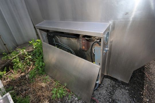 Mueller 1,000 Gal. S/S Farm Tank,with Hinged Lid, M/N M, S/N 32966, with Freon Jacket, 4-Prop Agitation with 1/4 hp/1725 RPM Drive Motor, 1.5" Clamp Type Bottom Connection, Overall Dims.: Aprox. 114" L x 68" W x 71" H (INV#78678)(Located @ the MDG Auction Showroom inPittsburgh, PA)(Rigging, Loading & Site Management Fee: $150.00 USD)
