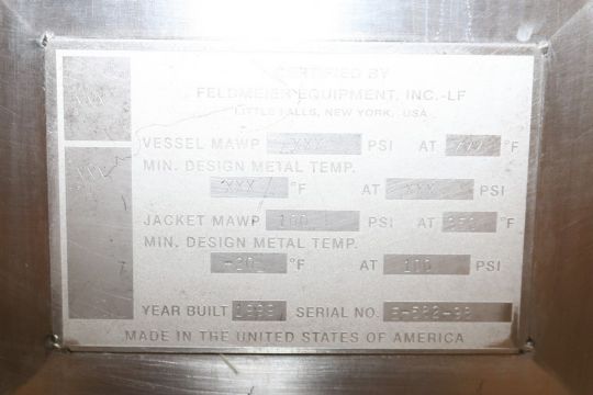 Feldmeier Aprox. 180 Gals. S/S Vertical Jacketed Tank, Rectangular Design, S/N F-582-93, with Top Mounted Cylinder Pump & S/S Shaft, Mounted on S/S Legs with S/S Hinge Lid (IN#70235) (LOCATED AT M. DAVIS GROUP AUCTION SHOWROOM--PITTSBURGH, PA) (Rigging, Handling & Site Management Fee: $150.00)