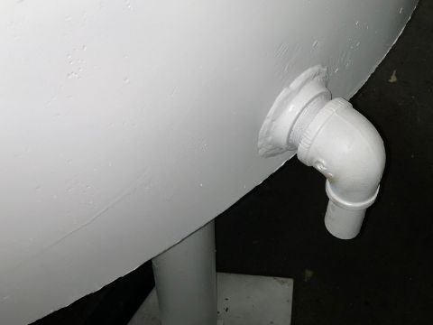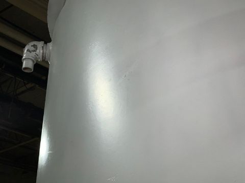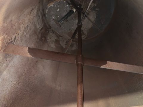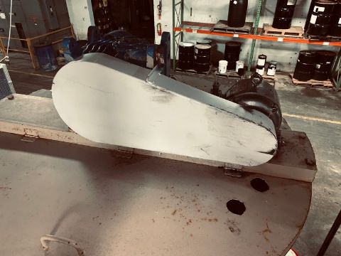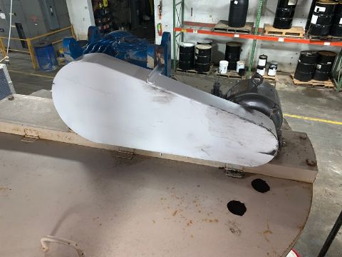 2000 Gallon Mild Steel Jacketed Mix Tank with scrape type mixing arms driven by a 5HP motor and belt driven gear box. Flat Top Split Lid on Top, Dish Bottom, 3" drain at bottom. Total height 14 ft. - requires flatbed to load. Loading fee $200