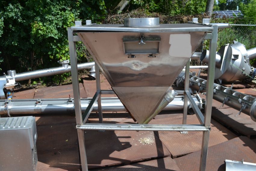 All S/S Rectangular Sloped Side Powder Hopper; 44"X 44" w/ Cover X 48"Deep, 14" Top Opening; On S/S Square Stock Frame. Required Loading Fee For Simple Loading $25. (Located in Deerfield, WI)