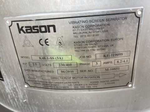 KASON VIBRATORY SEPARATOR/SIFTER MODEL K48-1-SS, S/N M-10851 (3A), 2.5 HP 230/460 V, INCLUDES (4) NEW KASON SCREENS, (NEW IN BOX), VIBRATORY MOTOR