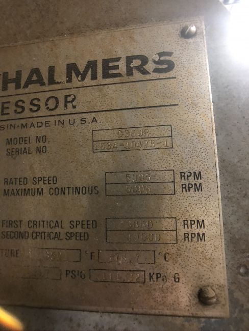 ALLIS CHALMERS VAPOR RECOVERY COMPRESSOR, MODEL D36JR, S/N 1634-10478-1, 5005 RPM RATED SPEED, 3860 RPM FIRST CRITICAL SPEED, LOUIS ALLIS 600 HP DRIVE MOTOR,1775 RPM, 460 V, MOTORTRONICS SOLID STATE A/C MOTOR CONTROL(CHECK NOTES AND PICS) (RIGGING, SITE MANAGEMENT, AND LOADING FEE. DOES NOT INCLUDE PACKAGING, SKIDDING, PALLETIZING, CRIBBING, CRATING, ETC: $ CONTACT FOR DETAILS )