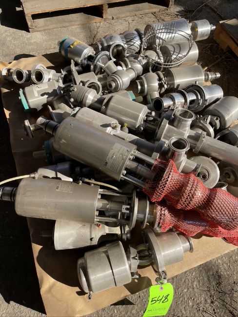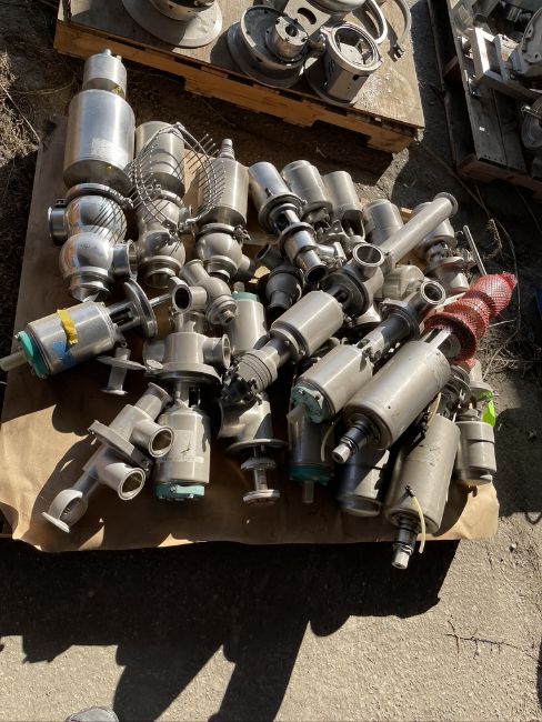 PALLET OF SUDMO AND TRI-CLOVER VALVE COMPONENTS, APPX (17) COMPLETE VALVES AND ADDITIONAL VALVE COMPONENTS
