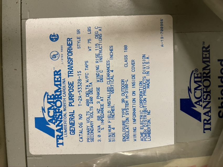 NEW ACME TRANSFORMER, CATALOG NO T-2A-53328-1S, PRIMARY VOTLS 480 DELTA W/FC TPS, SECONDARY VOLTS 240 DELTA, 3.0 KVA 60 HZ 3 PAHSE