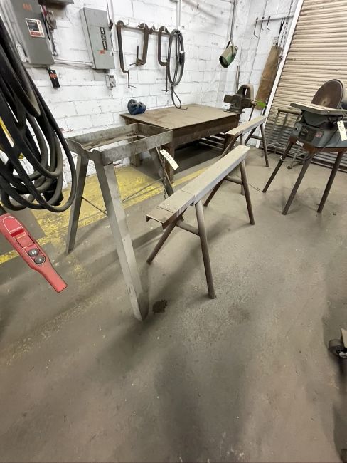(2) METAL SAW HORSES, (1) WELDING CONVEYOR, (1) S/S RACK