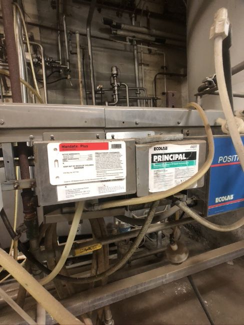 SANITATION AND CHEMICAL DOSING SYSTEM MOUNTED ON S/S RACK WITH ECOLAB POSITRONIC IV AND PROMINENT SIGMA PUMP