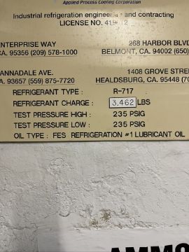 BULK BID, COMPLETE AMMONIA/GLYCOL REFRIGERATION SYSTEM, LOTS 307 - 313, REFRIGERANT TYPE R-717, REFRIGERANT CHARGE 3,462 LBS, TEST PRESSURE HIGH 235 PSIG, TEST PRESSURE LOW 235 PSIG (SUBJECT TO PIECEMEAL BIDDING)