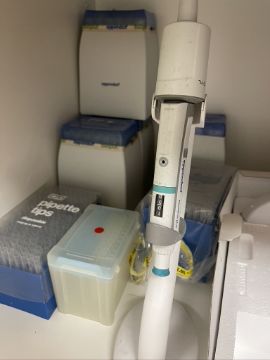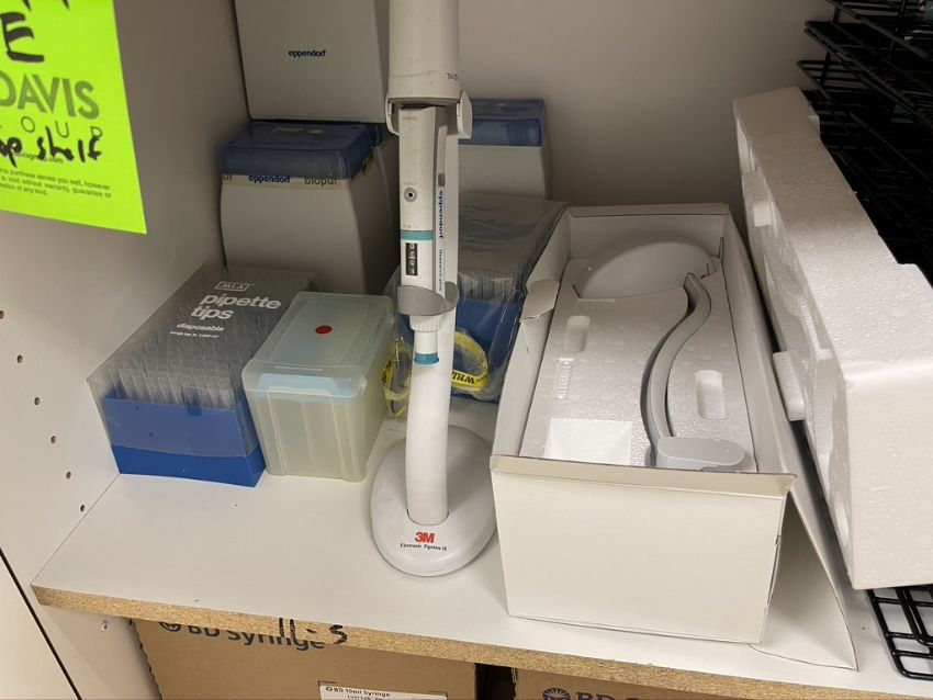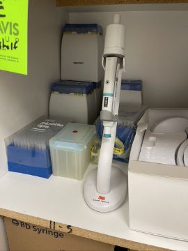 3M ELECTRONIC PIPETTER, PIPETTER BASE (NEW IN BOX) AND ASSORTED PIPETTER TIPS