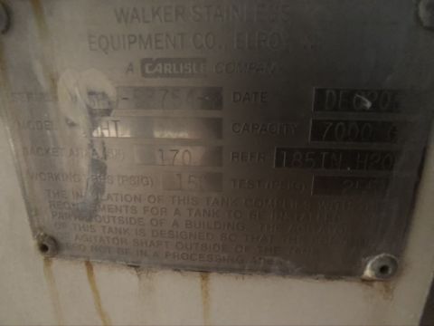 (1) WALKER 7,000 GALLON HORIZONTAL S/S GLYCOL JACKETED TANK, MODEL HHT, S/N SPG-53754-2, WITH VERTICAL AGITATION, S/S FRONTS (RECENTLY REFURBISHED)