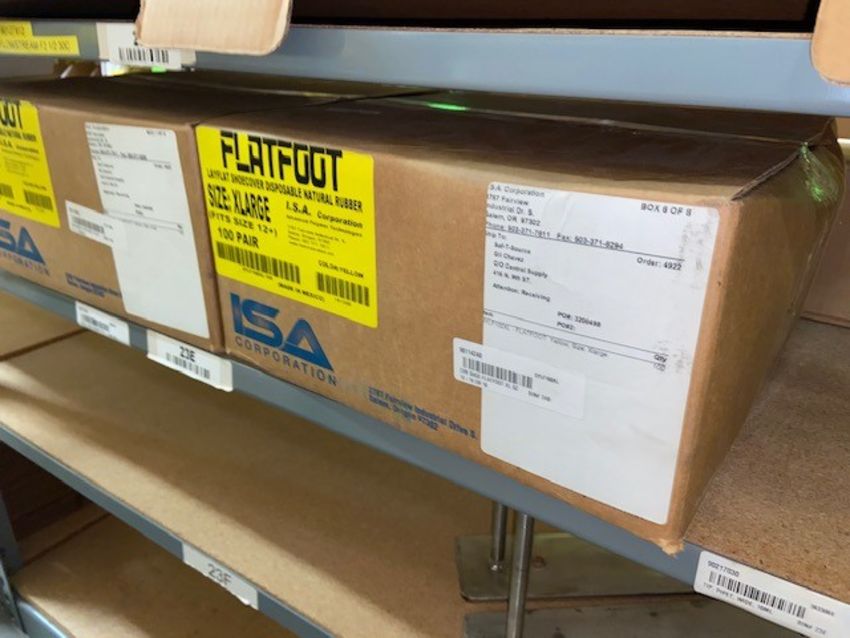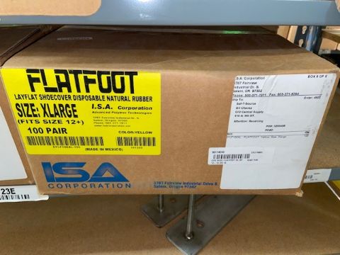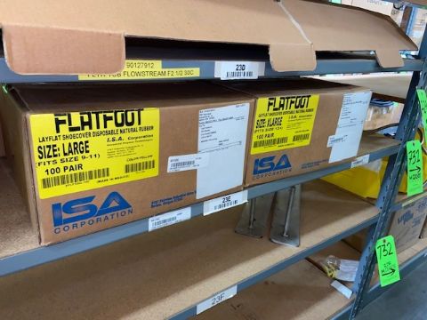 (2) BOXES (LARGE + EXTRA LARGE) FLAT FOOT LAY FLAT SHOE COVER, DISPOSAL NATURAL RUBBER (ON SECTION "23E" OF RACK) (RIGGING, SITE MANAGEMENT, AND LOADING FEE. DOES NOT INCLUDE PACKAGING, SKIDDING, PALLETIZING, CRIBBING, CRATING, ETC: $10)