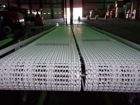Spantech Dual Lane S/S Sanitary Belt Conveyor, with Dual Intralox Belts - Each Belt 18" W, Aprox. 11 ft. Straight Side with 7 ft. Turn, All S/S Construction, SEW Eurodrive Motor, Current Infeed Height is 41" (This is adjustable with Adjustable Casters), Portable on Locking Casters, OAD 18 ft. L x 43" W x 48" H, Emergency Stop on Both Sides of Conveyor (NOTE: Unit will need to Ship Flatbed - Pleae inquier for Shipping Rates) (Located Hortonville, WI)