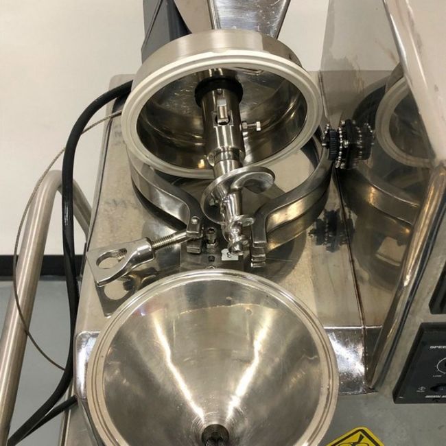 Vector-Freund roller compactor system, model TF-LABO, stainless steel construction, approximately 50 mm roll diameter x 24 mm roll face width. 120 Volts, 60 Hz, 1 Phase. As shown in photos. (Located Central New York)