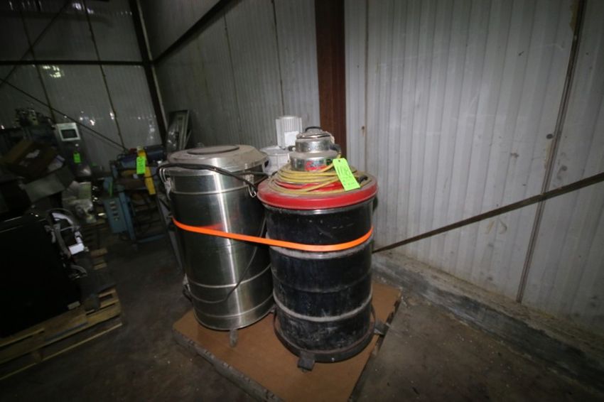 (3) Shop Vacuums with Collection Barrels, with 1-Milwaukee Vac Cleaner Head, Cat. No. 8945, 1-Busch Vacuum Head, with 1-S/S Collection Barrel (LOCATED IN DOUGLAS, GA) (Rigging, Handling, & Site Management Fee: $50.00 USD)
