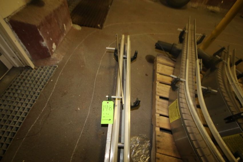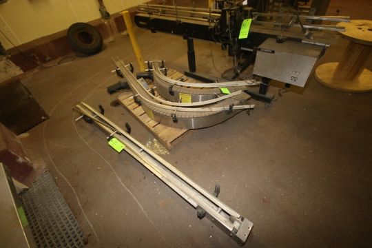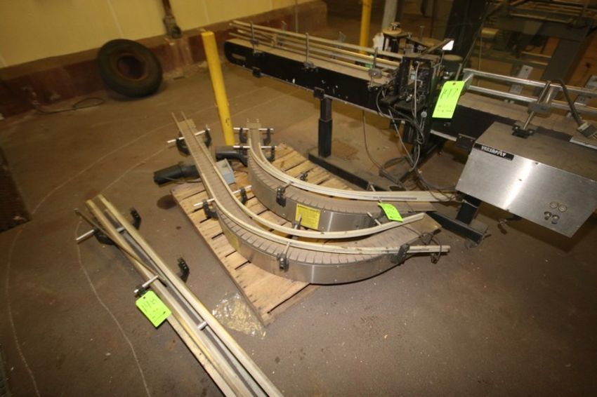 3-Sections of S/S Product Conveyor, with 2-Curve Sections & 1- Straight Section, 2-with Aprox. 4-1/2" W Plastic Product Conveyor Belt (LOCATED IN DOUGLAS, GA) (Rigging, Handling, & Site Management Fee: $100.00 USD)