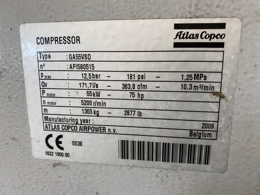 Atlas Copco Air Compressor, Model GA 55 VSD FF, S/N AP1580515 (Parts Only) (Load Fee $100) (Located Warehouse Belgium, WI)