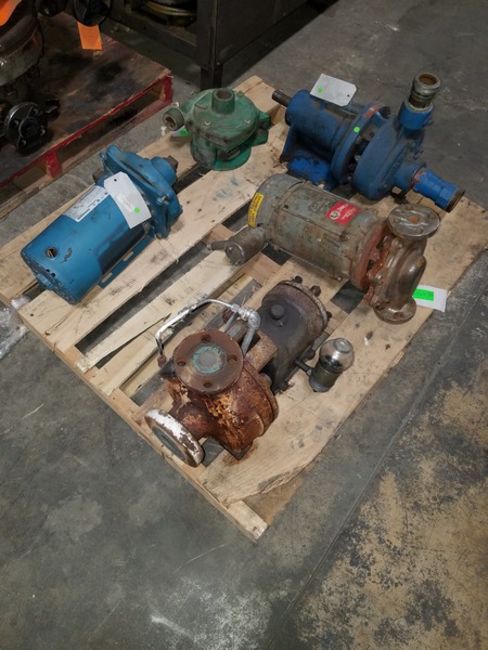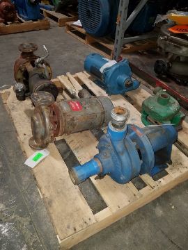 Lot of assorted Pumps - Mepco RC06-12-030-34-3 Centrifugal Pump with Marathon Electric 5K48TN218T, Gould’s 3196 Centrifugal Pump, Dean Line In Line Centrifugal Pump with Marathon Motor F H213999, Centrifugal Pump 1.5? x 1? with 4.375? Closed Bronze Impeller and .625? Shaft, Burks GNB6-1-1/2-5.75 Pump (Located Lebanon, PA) (Load Fee $25.00)