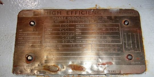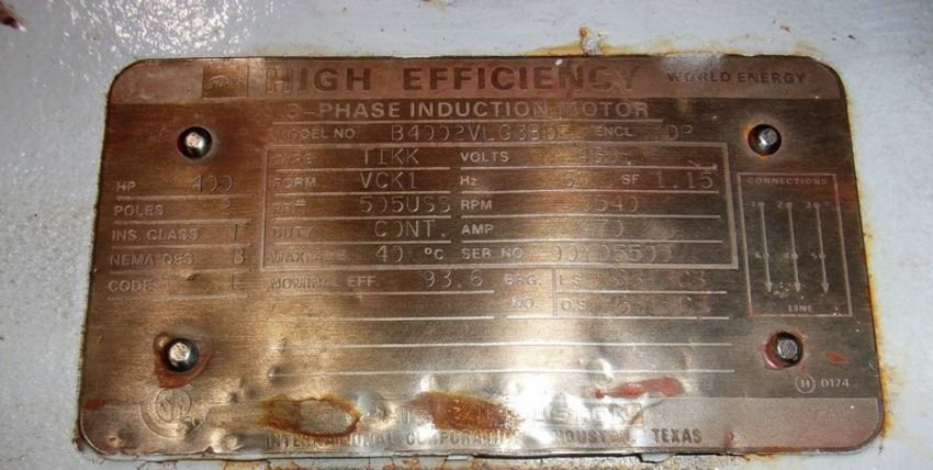 Toshiba 400 hp High Efficiency Motor, 34540 RPM, 460 V, This Motor was a Spare and Never Installed, Units Spins Free By Hand, Came Out of a Food Mfg. Facility, Tag Photo Shows All Additionial Information, Will Crate for $200 to ship Common Carrier (Loading Fee $100) (Located Hortonville, WI)