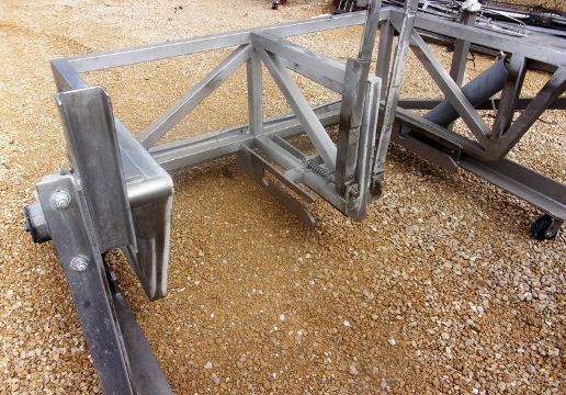 Dual Vemag S/S Cart Dumper, Unit last used in the dairy industry, Dump height is approx. 40 inches (Could be raised or lower with adjustable foot pads not provided), Unit is portable on casters, Dual air cylinders, Air operated, Carriage dimensions are 26 inches wide X 27 inches to lock bar, Overall dimensions are 80 inches wide X 54 inches deep X 42 inches high, There is no mfg tag but it appears to be an MTC (We will crate for 400 dollars to ship common carrier) (Loading Fee $100) (Located Hortonville, WI)
