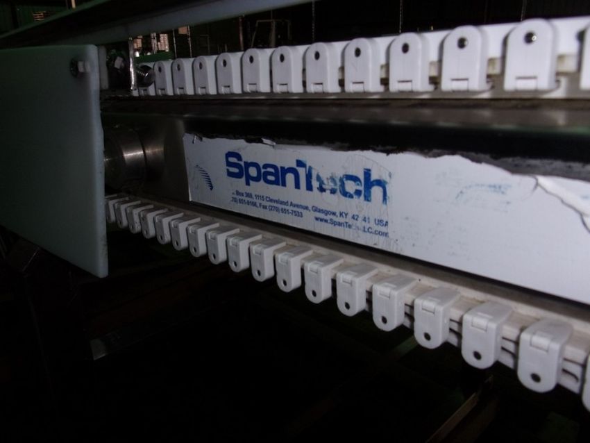 Spantech Dual Lane S/S Sanitary Belt Conveyor, with Dual Intralox Belts - Each Belt 18" W, Aprox. 11 ft. Straight Side with 7 ft. Turn, All S/S Construction, SEW Eurodrive Motor, Current Infeed Height is 41" (This is adjustable with Adjustable Casters), Portable on Locking Casters, OAD 18 ft. L x 43" W x 48" H, Emergency Stop on Both Sides of Conveyor (NOTE: Unit will need to Ship Flatbed - Please inquire for Shipping Rates) (Located Hortonville, WI)