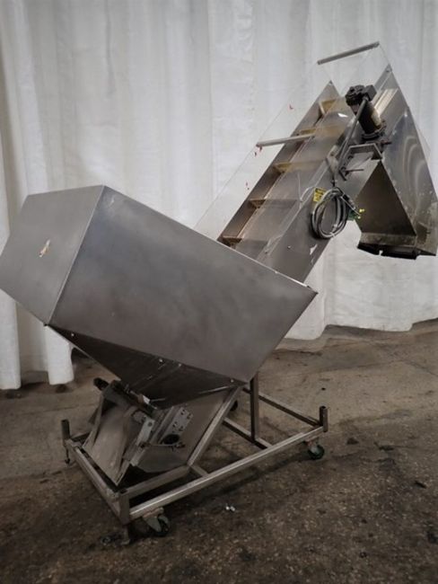 New England Machinery Stainless Steel Inclie Cleated Belt Conveyor, Stainless steel construction, Hopper measures 50 inches X 50 inches X 22 inches, 20 Inch wide solid belting, 3 Inch high cleats, Discharge height is 80 inches, Unit is portable on casters, This system will need to ship via flatbed(Loading Fee $250) (Located Hortonville, WI)