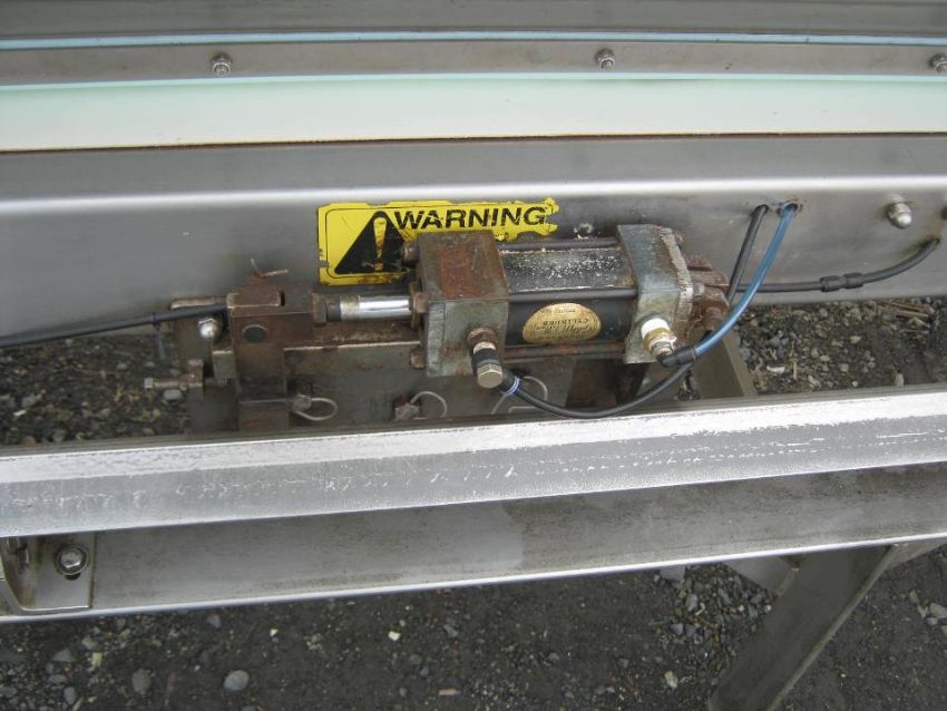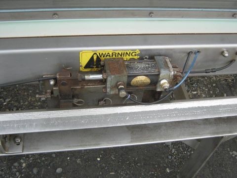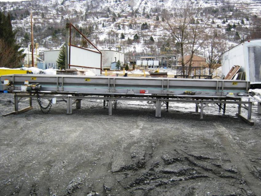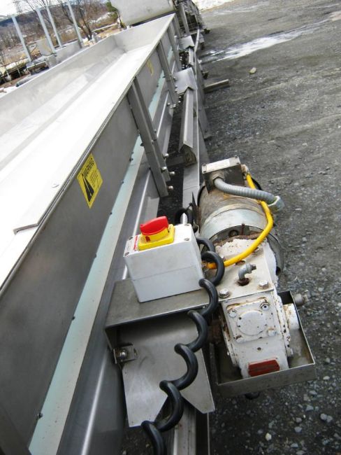 Used Meyer stainless steel flat slider belt troughed conveyor, Model FB-640-30. SN: 641. with White sanitary belting, 24’ long x 36” wide (belt 30” wide) x 32” high (OAH 44”), Stainless steel frame with 12” high sides. Conveyor is mounted on frame that moves back and forth to distribute product evenly when discharged. Shaker drive 1 hp 208-230-460/3/60. Belt drive 1 hp 208-230-460V/3/60. This unit is being stored indoors. No palletizing or crating. Loading free of charge. (Located Palmerton Pa. 18071.)