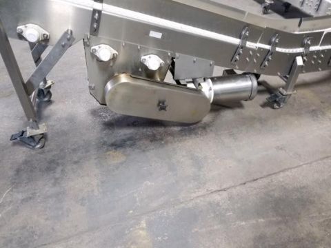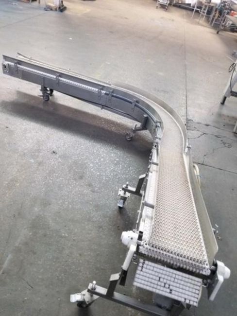 Aprx. 10 Inch Wide x 200" L S/S Sanitary Incline 90 Deg Intralox Belt Portable Conveyor, with 1 hp S/S washdown Baldor drive 3/60/208-230/460 volt, Units infeed around 14 inches and discharge at 36 inches and 40 inches, infeed and discharge heights are adjustable, last used in the food industry and remains in excellent working condition, 4 inch stainless steel guiderails, Unit will need to ship via flatbed (We can assist with shipping arrangements if needed) (Loading Fee $300) (Located Hortonville, WI)
