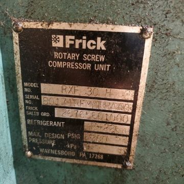 Frick 100 hp Rotary Screw Compressor, Model RXF 30 H, S/N 80271RFMNLHAA0, Frick Sales Order 26765601000 with Refrigeration R-22, 380 psig  (Located Perth Amboy, NJ)
