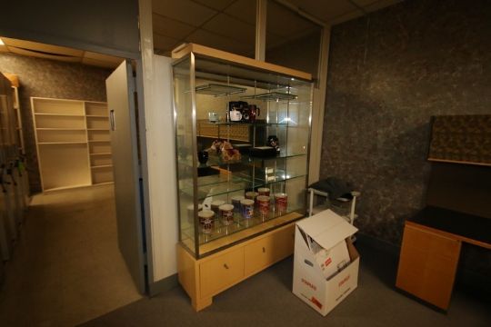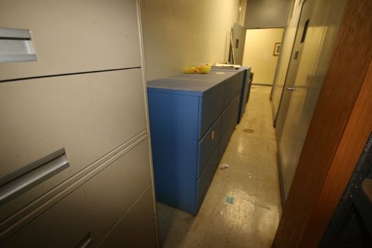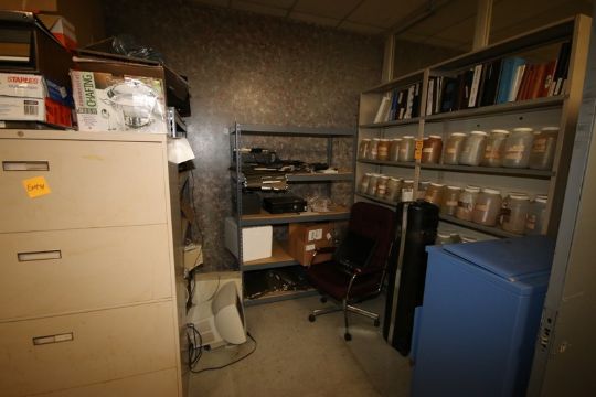 Contents of Offices Includes, (1) L-Shaped Desk, (1) Office Desk, (2) Rolling Office Chairs, Office Shelving, Horizontal Filing Cabinets, Office Shelving, (1) Glass Display Case, and Other Present Contents As Photographed ** Computers, Color Laser Printer and Phone Equipment Not Included (Old Tag 144) (Located Wappingers Falls, NY)